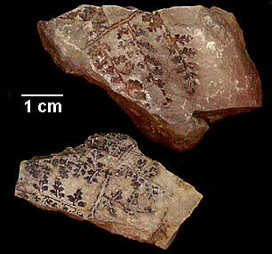 The two smaller Sphenopteris specimens give a better view of the finer detail of a Sphenopteris frond, while the larger one gives an overview of the frond structure ... apparently this larger frond was bent doubled over itself during preservation (or perhaps a second frond overlayed the first).