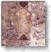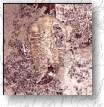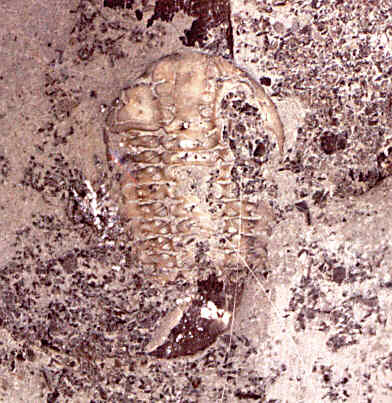 Elrathia antiquata. I collected this trilobite in March '96 from the Middle Cambrian Conosauga formation west of Rome, GA. This particular specimen measures about 8 mm from head to tail (or more correctly, from cephalon to pygidium). Note that this specimen is missing the free cheeks, giving the head a "sheep's head" shape. Evidently, this was a shed exoskeleton rather than the actual individual (although by now, the actual creature is dead, too). I penciled in (digitally--don't worry guys, I didn't destroy the fossil) the approximate position of the missing free cheeks. In addition to this one, I collected a larger specimen (about 1.5 cm long) of a heretofore unnamed species of Solenopleurella (this will appear on this page once I photograph and scan it), as well as five or six small assorted individuals under 2 mm long. |