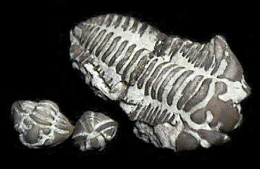 Flexicalymene meeki. Flexicalymene meeki is probably the most common trilobite in the Cincinattian formations. Note how the two smaller ones are enrolled, in a posture believed to be used as a defense against predators, much like the modern, yet unrelated, pillbug or sowbug (Southerners call them "rolly pollys"). The smaller specimens were collected by Mike Perona at Caesar's Creek, and while I am not the actual collector, the days that I spent trying to collect these make me consider them to be my "just desserts" for all the time and effort spent trying to find them. The larger specimen measures about 1 1/4 inches long and has a rather interesting story behind it. On the way back from our trip to Ohio, my wife needed to nurse the baby, so we stopped at a nice roadcut about 12 miles from the KY border. I got out and collected for a few minutes while the baby ate her fill. While clambering up the side of the roadcut, I noticed to my left the back half of a nice Flexi, but without a front half to be seen anywhere, which was extremely disappointing, as Flexis were what I had hoped to find during our trip to OH. Well, as I clambered another 5 or 10 feet up, I noticed to my right the front half of a nice Flexi, which I judged to be from a different specimen. Back in the car, I wrapped the two halves up in a paper towel, and headed onward back to Tallahassee, FL (our fair city). At the next convenience store stop, I took them out and examined them more closely. Upon examination, I noticed too many similarities on the two halves to be coincidence and realized that I had both halves of the same specimen. Apparently, when it weathered out and went tumbling down the side of the roadcut, it had broken in half, with the two halves scattering in wildly different directions...or perhaps further weathering pushed them apart down separate avenues. In any case, the break was clean enough that they could be glued back into the one nice specimen that you see displayed here. |