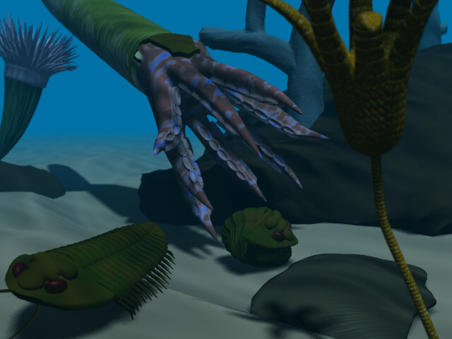Above is an image showing the "typical" environment (constructed by me in Lightwave 3d) that trilobites once inhabited, sharing their waters with predatory cephalopods (the squid-like creature), crinoids (the flower-like creature to the right/foreground - relative of the starfish), and rugose corals (the anemone-like creature to the left/background). The particular trilobite species shown here is a Flexicalymene meeki.