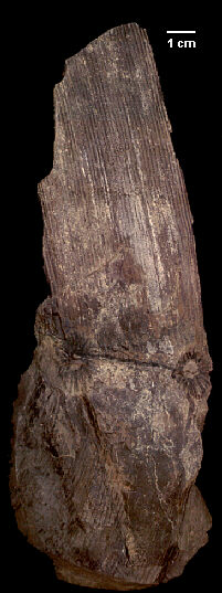 Calamites sp. Note the "bamboo" like appearance of the stem, with numerous parallel veins and a jointed stem. Along the joint, one can see two radial scars where smaller branches split off of the main stem. While the genus Calamites is extinct, modern horsetails still live today, but at generally under a meter tall, they do not attain the tree-like proportions (estimated up to 20 meters or 65 feet) of their extinct relatives. | |