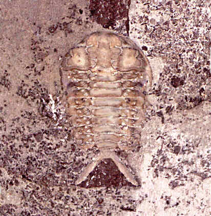 Elrathia antiquata. I collected this trilobite in March '96 from the Middle Cambrian Conosauga formation west of Rome, GA. This particular specimen measures about 8 mm from head to tail (or more correctly, from cephalon to pygidium). Note that this specimen is missing the free cheeks, giving the head a "sheep's head" shape. Evidently, this was a shed exoskeleton rather than the actual individual (although by now, the actual creature is dead, too). I penciled in (digitally--don't worry guys, I didn't destroy the fossil) the approximate position of the missing free cheeks. In addition to this one, I collected a larger specimen (about 1.5 cm long) of a heretofore unnamed species of Solenopleurella (this will appear on this page once I photograph and scan it), as well as five or six small assorted individuals under 2 mm long. |